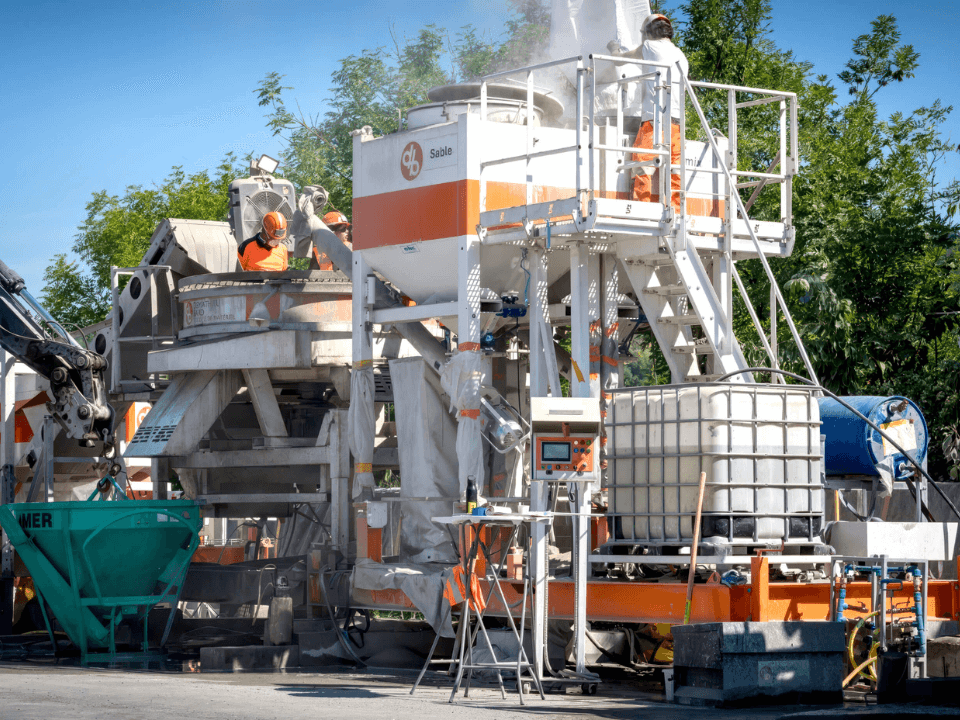 L’ensemble des opérations – introduction des matériaux, injection des liquides et adjuvants – est entièrement piloté par un système automatisé garantissant une application précise et stable.